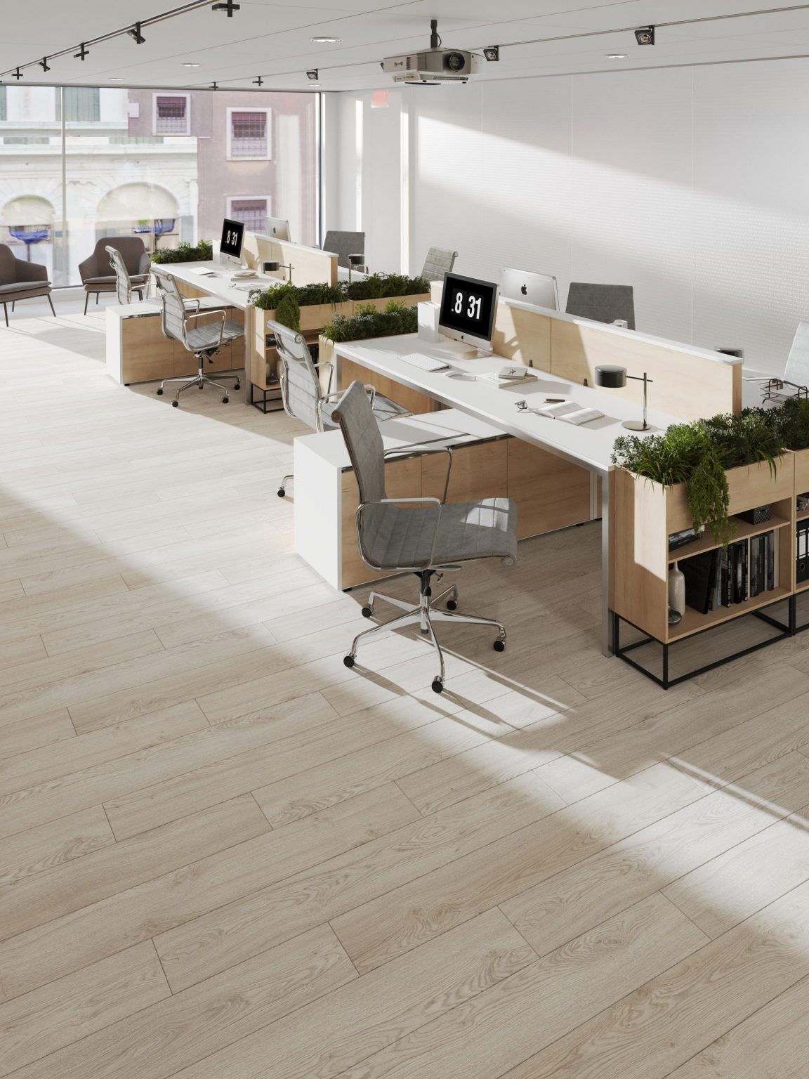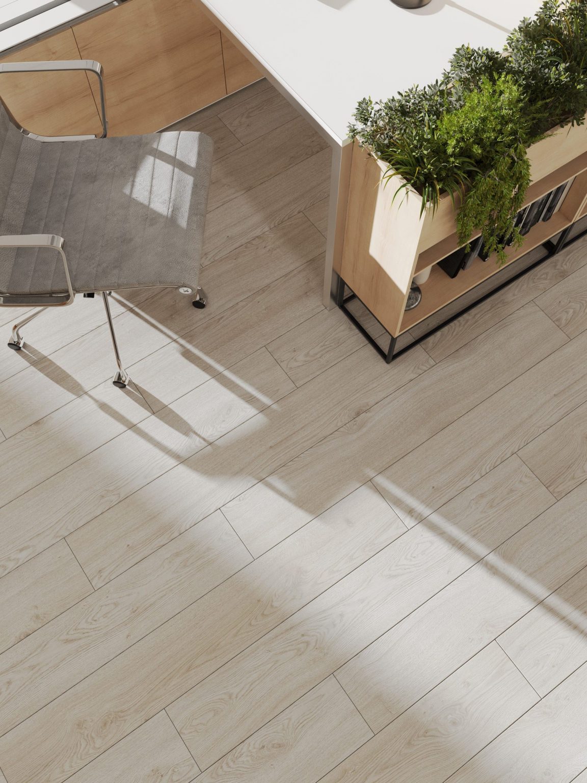 Материал не боится солнечного света, не выцветает, легко очищается от пыли и загрязнений. Подходит для установки на тёплый пол. Светлый оттенок дуба делает его универсальным решением как для классических, так и для современных интерьеров.