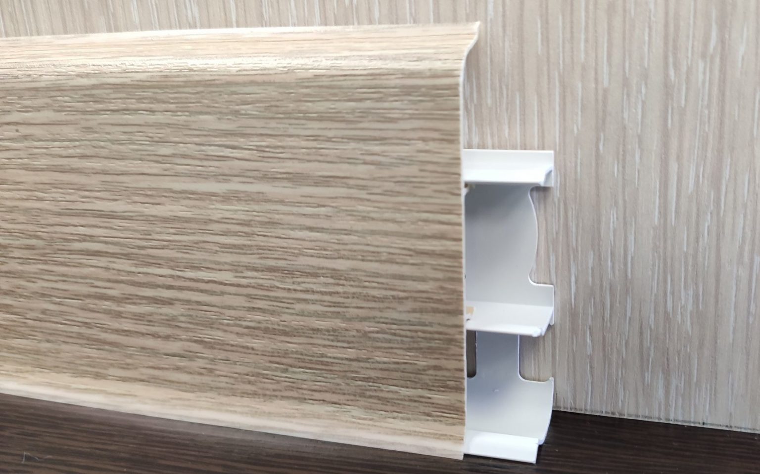 Плинтус Deconika Д-П55 213 Дуб северный — надёжный и стильный пластиковый плинтус с холодным древесным оттенком, имитирующим натуральный дуб северных пород. Идеально подходит для оформления интерьеров в скандинавском, минималистичном и современном стилях.