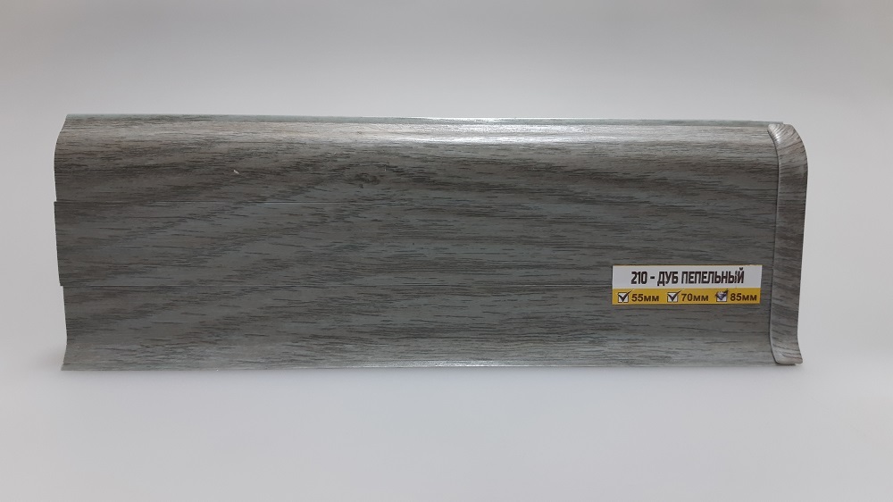 Цвет Дуб пепельный 210 — светло-серый древесный оттенок с натуральной текстурой, который отлично впишется в современные интерьеры в стиле сканди, лофт, минимализм и эко. Этот плинтус гармонирует с ламинированными, виниловыми и паркетными покрытиями холодных и нейтральных оттенков.