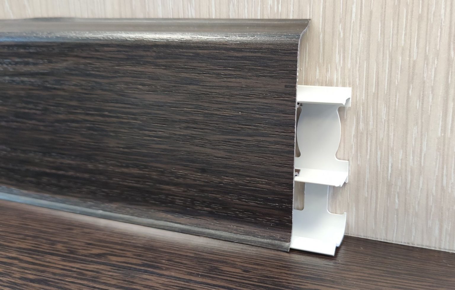 Плинтус Идеал Классик Венге темный 303 — прочный и стильный элемент отделки, предназначенный для аккуратного оформления перехода между полом и стеной. Глубокий тёмный оттенок «Венге темный» с выразительной древесной текстурой придаёт интерьеру благородство и насыщенность, подчёркивая элегантность напольного покрытия.
